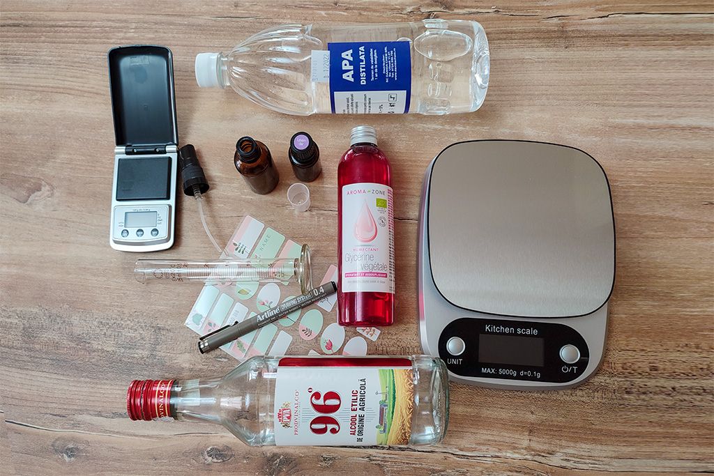 Pesez soigneusement tous les ingrédients ! Mélanger l'alcool avec les huiles essentielles et homogénéiser jusqu'à intégration complète. Mélanger la glycérine avec l'eau distillée et mélanger jusqu'à intégration complète. Ajoutez tous les ingrédients dans le flacon pulvérisateur et agitez jusqu'à homogénéisation. Vérifier les spécifications du fabricant en ce qui concerne le conservateur.